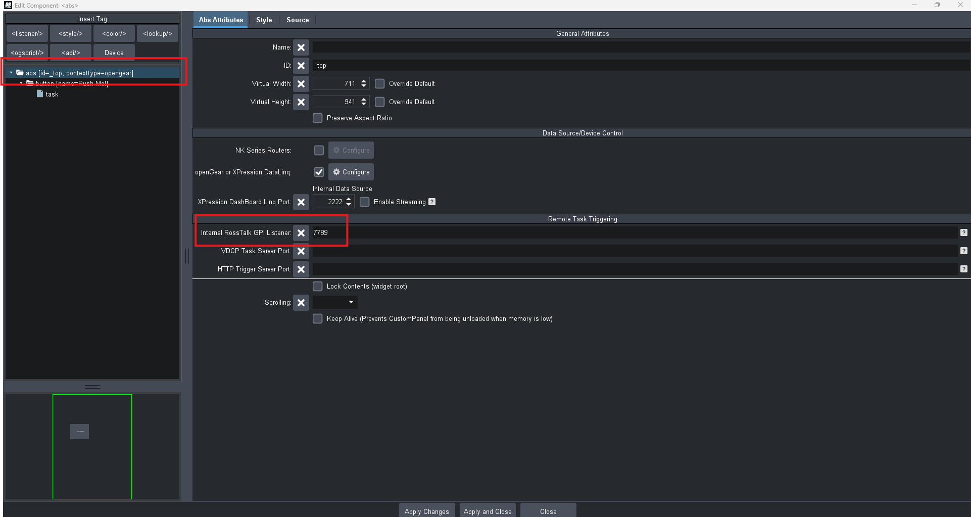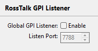 In Dashboard, you can of course use the Global RossTalk listener, however I would recommend setting the GPI listener port on your custom panel directly. To do this, go into Panel Builder Edit Mode, double click on a component, navigate to the top most abs of your panel, and you will see a field for 'Internal RossTalk GPI Listener'. I would again set this to 7789 instead of 7788 (which is the default for RossTalk). You don't need to enable the Global Listener for this to work. In my example, I have the global listener disabled and am using port 7789 on the panel itself.