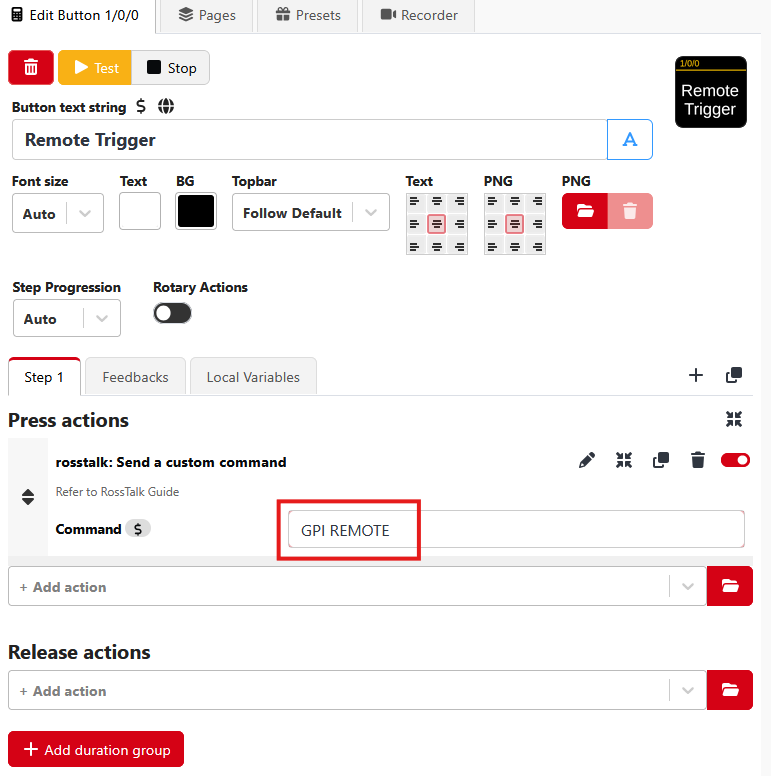 I would recommend using the Custom Command option in this instance (purely because I have verified it works, however the Trigger GPI by Name command works as well with no 'parameters' set). The custom command you will use is GPI [TRIGGER ID] where [Trigger ID] is your trigger ID on the Dashboard Button you'd like to trigger. In my example, I used 'GPI REMOTE' since 'REMOTE' is the trigger ID of my button.