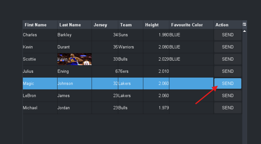 However I was wondering If it is possible to show a non-data related component in a cell but instead render a button for example that triggers an action/task ? My Goal was to have this button for each row in the last column.