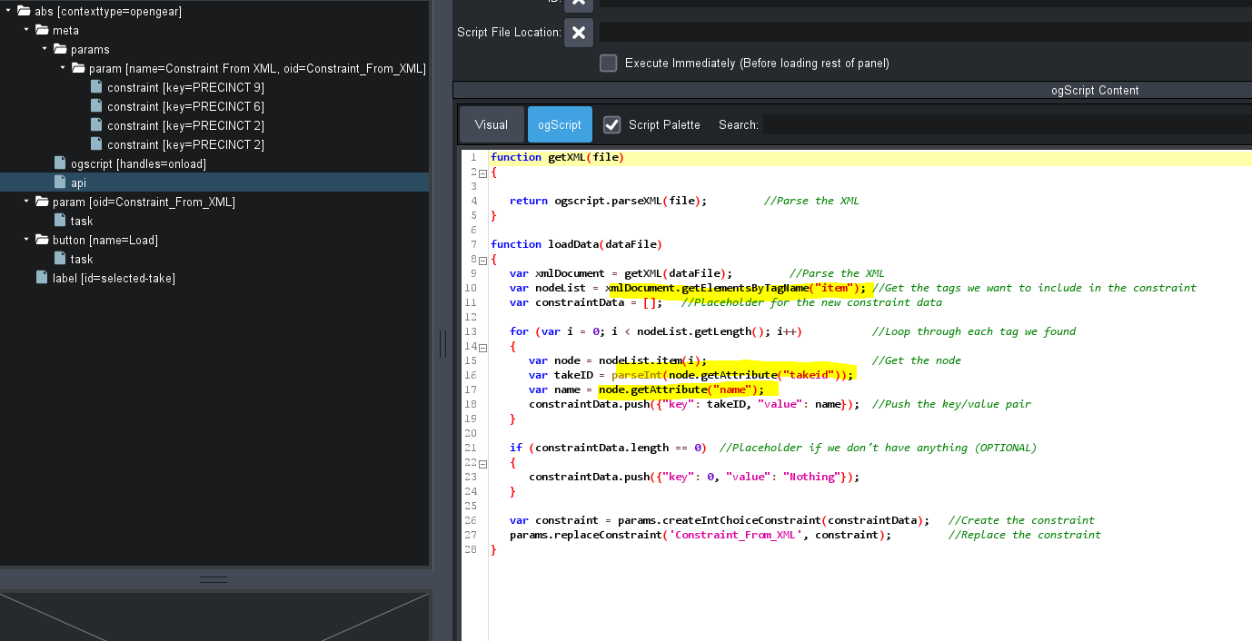 <abs contexttype="opengear" style=""> <meta> <params> <param access="1" constrainttype="INT_CHOICE" name="Constraint From XML" oid="Constraint_From_XML" precision="0" type="INT32" value="10015" widget="combo"> <constraint key="10001">Arthur A. Aaronson</constraint> <constraint key="10015">Buford B. Buckthorn</constraint> <constraint key="2156">Carl C. Carlson</constraint> <constraint key="8469">Dianna D. Dickenson</constraint> <constraint key="2449">Erica E. Ellis</constraint> </param> <param access="1" constrainttype="INT_NULL" name="Take IDs" oid="all-take-ids" precision="0" type="INT16_ARRAY" value="10001;10015;2156;8469;2449" widget="label"/> <param access="1" maxlength="0" name="Names" oid="all-names" precision="0" type="STRING_ARRAY" widget="label"> <value>Arthur A. Aaronson</value> <value>Buford B. Buckthorn</value> <value>Carl C. Carlson</value> <value>Dianna D. Dickenson</value> <value>Erica E. Ellis</value> </param> <param access="1" constrainttype="STRING_CHOICE" name="Table" oid="table" precision="0" type="INT32" value="1" widget="table"> <constraint>all-take-ids</constraint> <constraint>all-names</constraint> </param> </params> <ogscript handles="onload">var newConstraint = params.createIntChoiceConstraint(["Nothing"]);params.replaceConstraint('Constraint_From_XML', newConstraint);</ogscript> <api>function getXML(file){ //for testing, I am replacing the file XML with hard-coded XML. Remove these lines for loading an actual file file = '<?xml version="1.0" encoding="UTF-8" standalone="yes"?>\n' + '<graphics>\n' + ' <item takeid="10001" name="Arthur A. Aaronson"/>\n' + ' <item takeid="10015" name="Buford B. Buckthorn"/>\n' + ' <item takeid="2156" name="Carl C. Carlson"/>\n' + ' <item takeid="8469" name="Dianna D. Dickenson"/>\n' + ' <item takeid="2449" name="Erica E. Ellis"/>\n' + '</graphics>' return ogscript.parseXML(file); //Parse the XML}function loadData(dataFile){ var xmlDocument = getXML(dataFile); //Parse the XML var nodeList = xmlDocument.getElementsByTagName("item"); //Get the tags we want to include in the constraint var allTakeIDs = []; var allNames = []; var constraintData = []; //Placeholder for the new constraint data for (var i = 0; i < nodeList.getLength(); i++) //Loop through each tag we found { var node = nodeList.item(i); //Get the node var takeID = parseInt(node.getAttribute("takeid")); var name = node.getAttribute("name"); constraintData.push({"key": takeID, "value": name}); //Push the key/value pair allTakeIDs.push(takeID); allNames.push(name); } if (constraintData.length == 0) //Placeholder if we don't have anything (OPTIONAL) { constraintData.push({"key": 0, "value": "Nothing"}); allTakeIDs.push(0); allNames.push(''); } var constraint = params.createIntChoiceConstraint(constraintData); //Create the constraint params.replaceConstraint('Constraint_From_XML', constraint); //Replace the constraint params.setAllValues('all-take-ids', allTakeIDs); params.setAllValues('all-names', allNames);}</api> </meta> <param expand="true" height="90" left="32" oid="Constraint_From_XML" top="48" width="626"> <task tasktype="ogscript">var index = this.getConstraint().getChoice(this.getValue());params.setValue('table', 0, index);</task> </param> <button buttontype="push" height="95" left="673" name="Load" top="47" width="183"> <task tasktype="ogscript">loadData('data.xml');</task> </button><param bottom="8" expand="true" height="792" left="7" oid="table" right="9" showlabel="false"> <config key="w.rowheight">40</config> </param></abs>