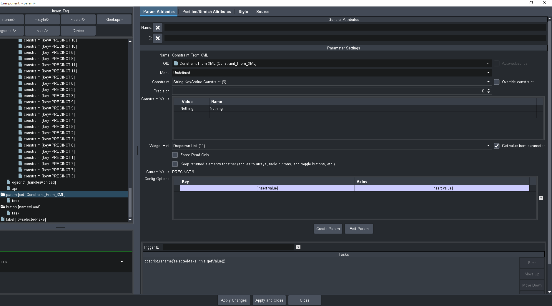 <?xml version="1.0" encoding="UTF-8"?><abs contexttype="opengear" style=""> <meta> <params> <param access="1" constrainttype="STRING_STRING_CHOICE" name="Constraint From XML" oid="Constraint_From_XML" precision="0" type="STRING" value="PRECINCT 9" widget="combo"> <constraint key="PRECINCT 9">Aaron Cunningham</constraint> <constraint key="PRECINCT 6">Adam Brandow</constraint> <constraint key="PRECINCT 2">Adam McCusker</constraint> <constraint key="PRECINCT 2">Albert Glenn Diggs</constraint> </param> </params> <ogscript handles="onload">var newConstraint = params.createStringStringChoiceConstraint(["Nothing"]);params.replaceConstraint('Constraint_From_XML', newConstraint);</ogscript> <api>function getXML(file){ return ogscript.parseXML(file); //Parse the XML}function loadData(dataFile){ var xmlDocument = getXML(dataFile); //Parse the XML var nodeList = xmlDocument.getElementsByTagName("item"); //Get the tags we want to include in the constraint var constraintData = []; //Placeholder for the new constraint data for (var i = 0; i < nodeList.getLength(); i++) //Loop through each tag we found { var node = nodeList.item(i); //Get the node var takeID = parseInt(node.getAttribute("takeid")); var name = node.getAttribute("name"); constraintData.push({"key": takeID, "value": name}); //Push the key/value pair } if (constraintData.length == 0) //Placeholder if we don't have anything (OPTIONAL) { constraintData.push({"key": 0, "value": "Nothing"}); } var constraint = params.createIntChoiceConstraint(constraintData); //Create the constraint params.replaceConstraint('Constraint_From_XML', constraint); //Replace the constraint}</api> </meta> <param expand="true" height="90" left="32" oid="Constraint_From_XML" top="48" width="626"> <task tasktype="ogscript">ogscript.rename('selected-take', this.getValue());</task> </param> <button buttontype="push" height="95" left="673" name="Load" top="47" width="183"> <task tasktype="ogscript">loadData('constraint-xml-tester.xml');</task> </button> <label height="142" id="selected-take" left="34" style="txt-align:center" top="164" width="815"/></abs>