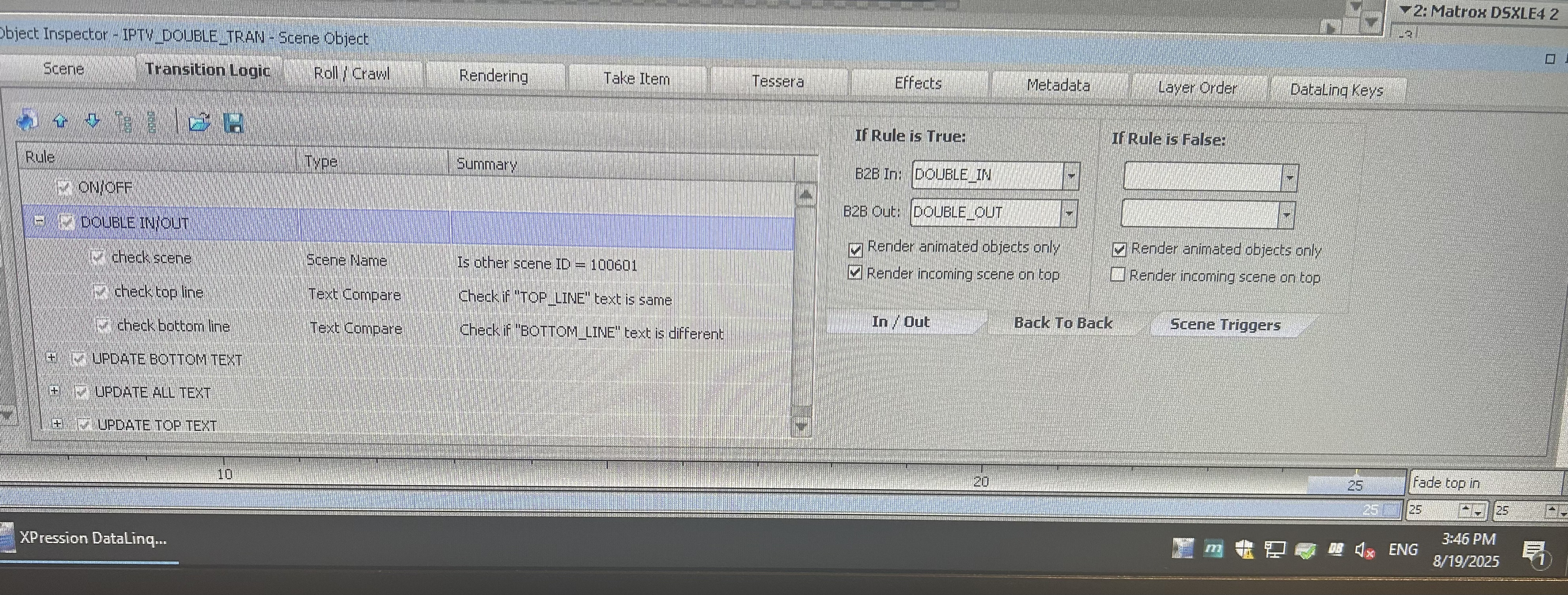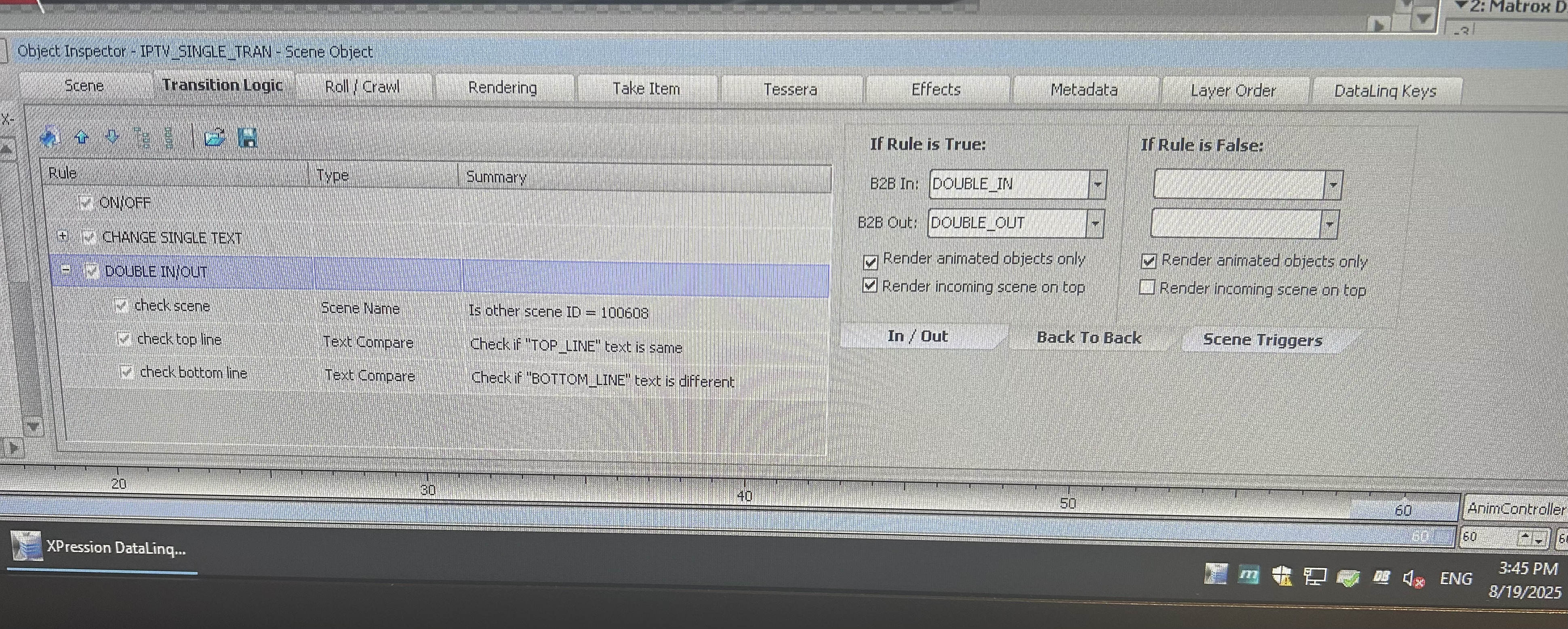 When I fire my single lined lower after the double line it moves the text down and back up and stays stuck at the top of the bar. However, if I fire the single lower again, it will then move into position. Attached are images of my transition logic for both the single lined lower and the double.