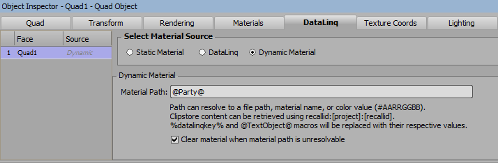 the easiest way for me is just a little scripting. Add a text object that is not visible. Datalinq this text object to the data that shows party. Then right click on that text object and look for "edit script event" or something like that. I'm not at my Xpression. Add this script to that text object. Remember to compile it by clicking on the orange icon near the top of the window. You will have to substitute the names of the various quads for what I have put in " ". Also, you might have to modify the script if your data sends a different character that the ones I have used. Good luck.