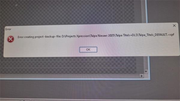 While saving the XPression project we get the attached error message. The "normal" file is saved, but the backup one clearly not. Removing the plus sign in the file path did not help by the way. Anything we could do to solve this (besides making a tilde version manually)?