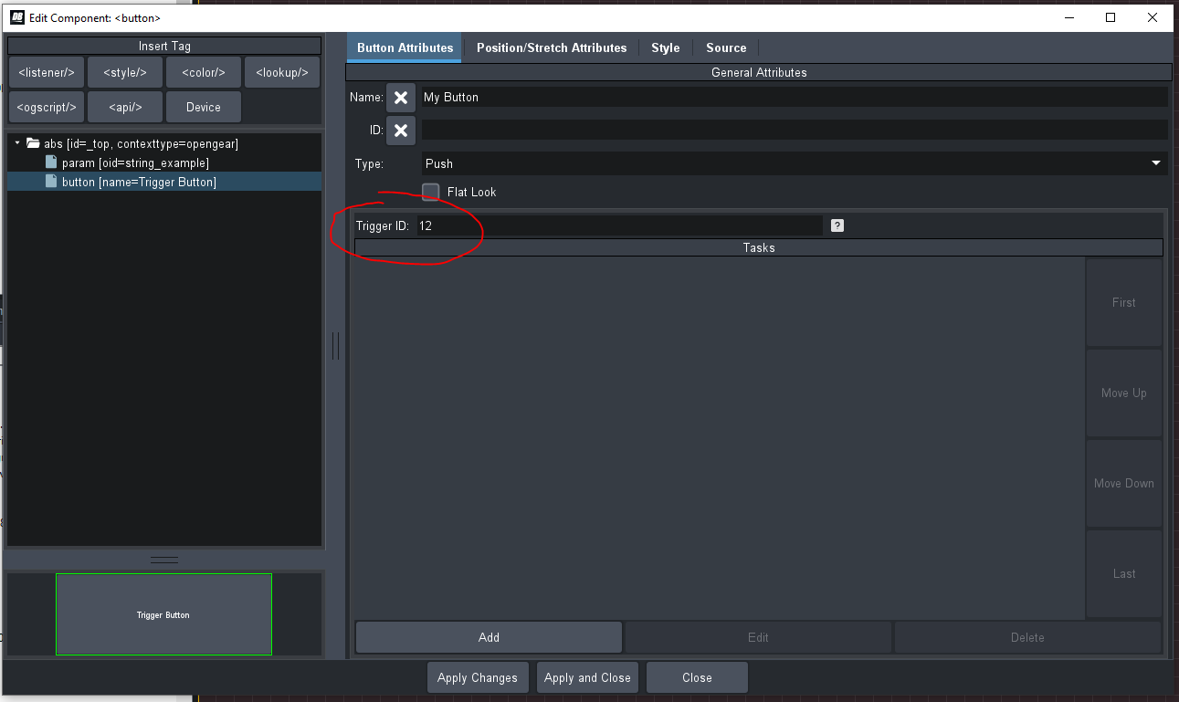 I built a custom panel in Dashboard with a bunch of buttons that load and fire clips on a couple Trias. The buttons work as intended if I click on them in Dashboard. I can't seem to figure out how to send a RossTalk command from an XPression or Carbonite that will fire one of my buttons on my custom panel in Dashboard. I enabled RossTalk GPI Listener in preferences in Dashboard, and I have a GPI/O board configured in XPression that communicates to the IP of the Dashboard computer on the correct port. I am not sure how to program the button in Dashboard to receive a command, or what the command is that I'd put in the XPression RossTalk event.