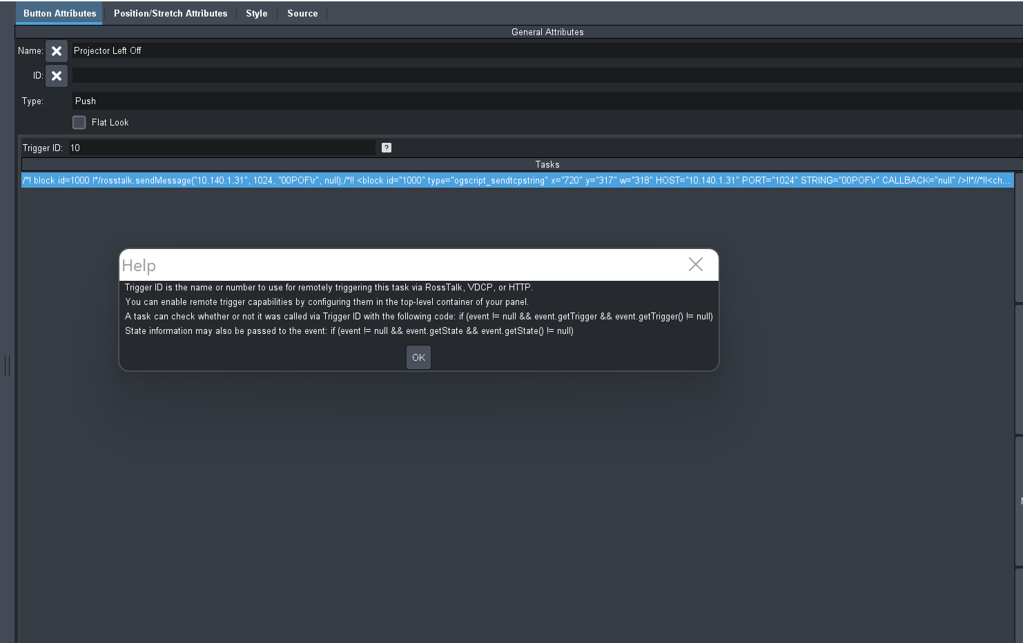 I have a custom panel with a button that is triggered by GPIO 10, when the GPIO is On i what it to turn on the projector and when the GPIO is off turn off the projector. What i need help with is editing the example script below to suit my requirement as in put the state into a varable to use in an if statement