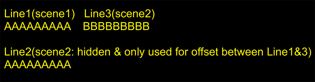 For that i need to store data of Line1 of SCENE1 into Line2 of SCENE2 so that i can do VL offset between Line2 & 3 in SCENE2. The Line2 reference text in SCENE2 graphic will always be hidden.