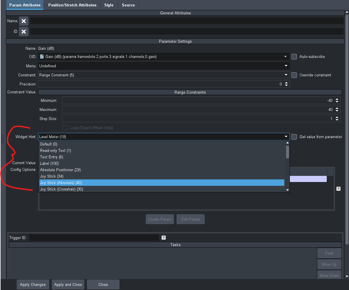 The panel works correctly, but in addition to representing this gain parameter for those six channels as a level meter, I would like to display it as an audio meter (similar to the MV PIPs), so it would show the audio modulation in real time. Looking at the widget hint tab, I couldn't find this option (image below). Do you know if this is possible to do?