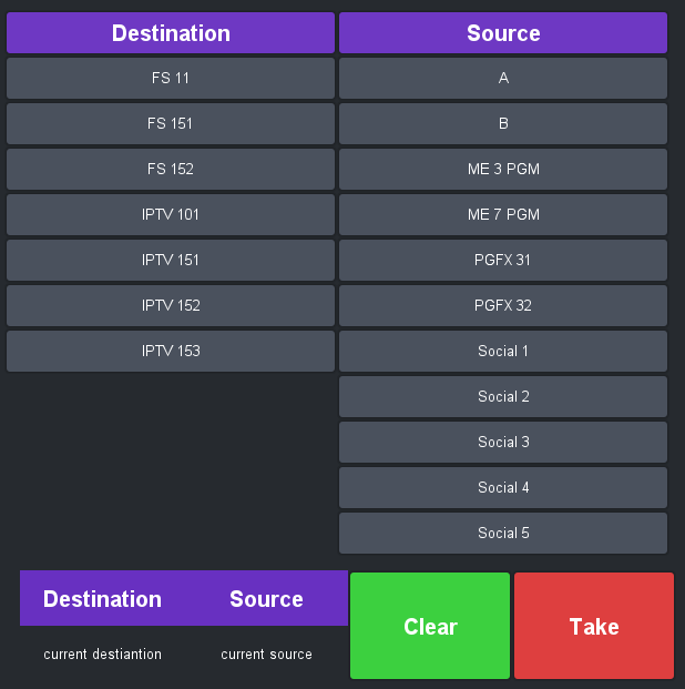I can make a button that will route a specific source to a specific destination but what I want is a Button with will route a variable defined by another button to a variable defined by yet another button
