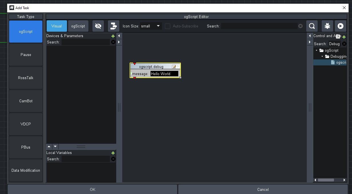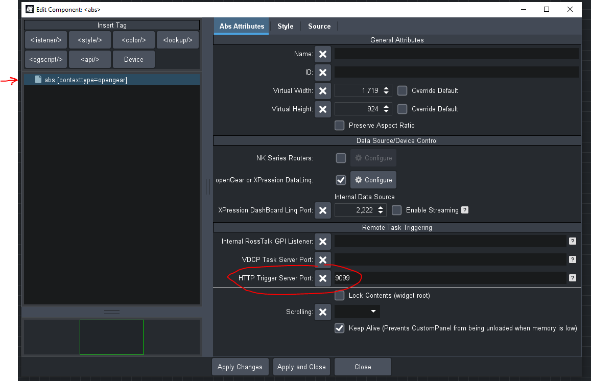 <abs contexttype="opengear" httptriggerport="9099" keepalive="true" subscriptions="true"> <button buttontype="push" gpi="run-script" height="136" left="28" name="Run Script" top="65" width="233"> <task tasktype="ogscript">ogscript.debug("hello world");if (event.getTrigger && event.getTrigger() != null){ ogscript.debug("TRIGGER: " + event.getTrigger());}if (event.getState && event.getState() != null){ ogscript.debug("STATE: " + event.getState());}</task> </button></abs>