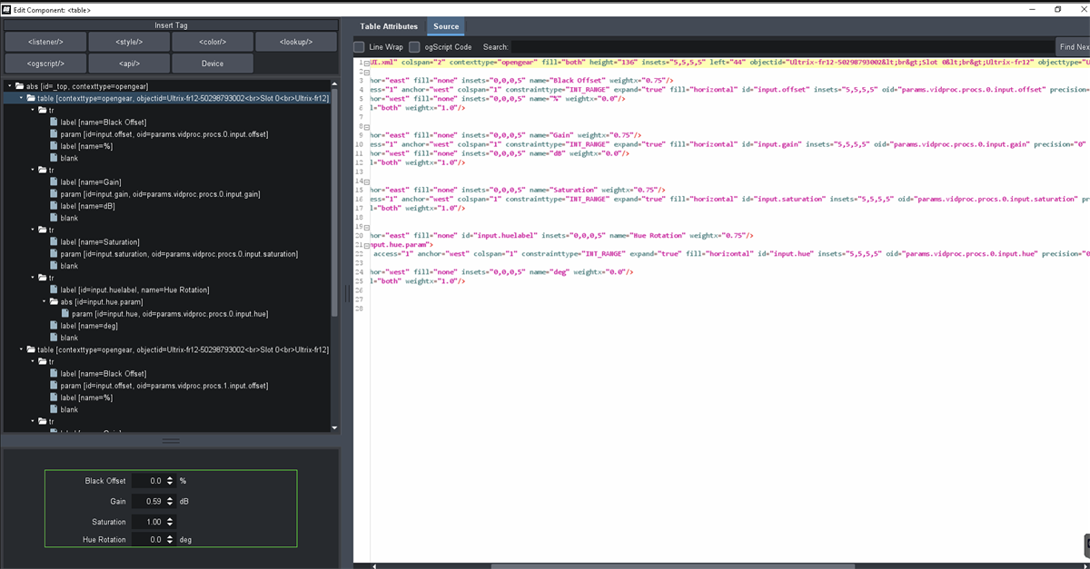 Thanks for the info. I have a follow up question. Using the example panel you made, I want to have a button that inputs a specific value into the parameters of the procamp. Where are those values in the source mode? Also, I noticed in your example when you copied the proc amp component to the new blank panel the value pasted in the new panel is different. You copied a .65 gain and pasted a .59 gain. Anyway, how would I code a button that inputs a specific value into that gain parameter?