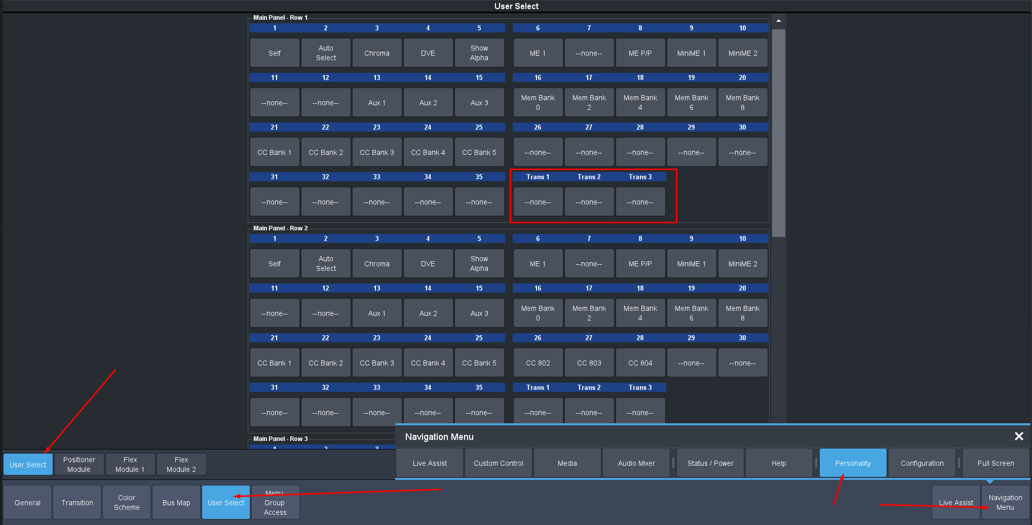 In the Personality Menu under User Select Buttons. Each Row is assignable