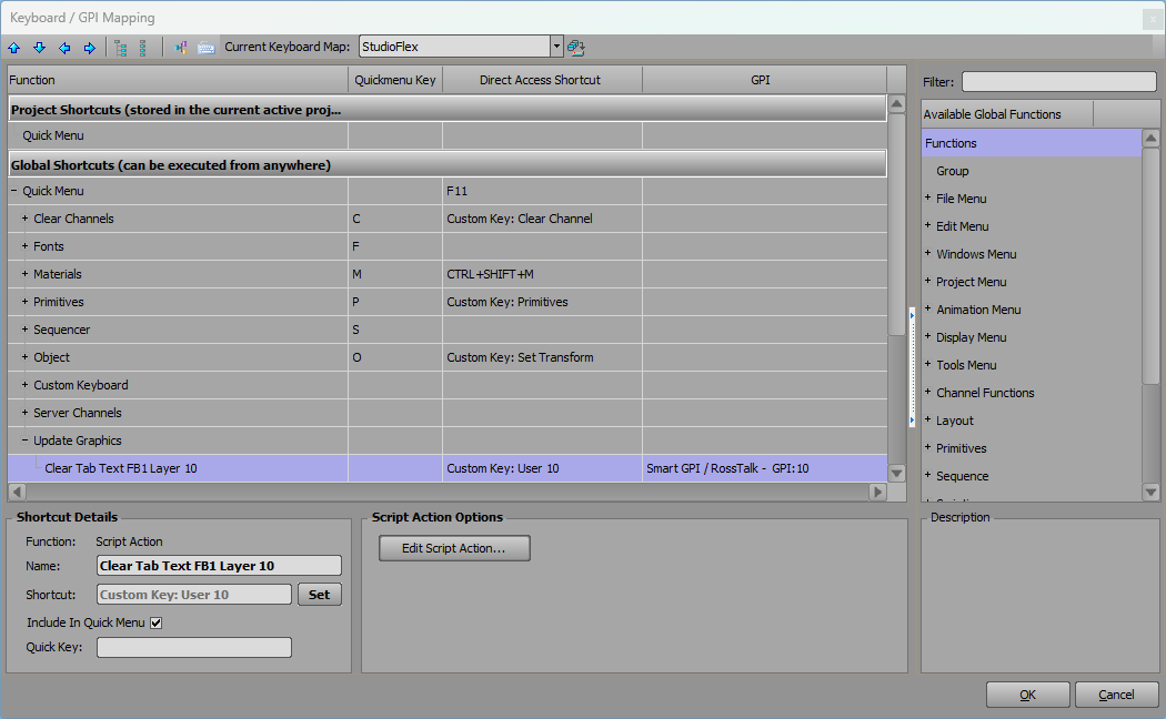 Add a Keyboard/GPI Map Script Action to your XPression engine like this: