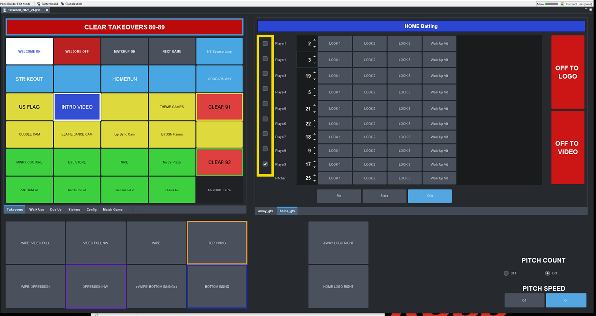 Here's the dashboard and a screenshot of the dashboard. The yellow box highlights the checkboxes that I use to indicate current player at bat. This is datalinqed with the "at bat data" in the Xpression scene.