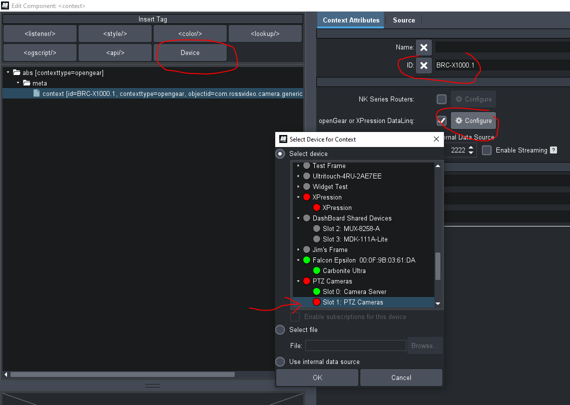 The context tag is used to add a device to your custom panel so you can interact with its commands, parameters, and widgets. When you drag and drop into your panel, you are essentially creating a context within your panel that is pointed at the device you dragged from. In the case of what you're trying to achieve here, adding the context tag and pointing it at your Sony BRC Camera (using the steps I described above), you will be able to see the Sony parameters and commands when you are creating scripts or building your panel user interface.