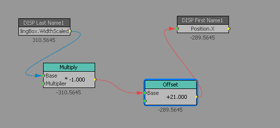 This is in a scene I happen to be working on at the moment so the multiply by -1 is to make it move left across the screen, you can simply remove that block to make the second name position after the first name.