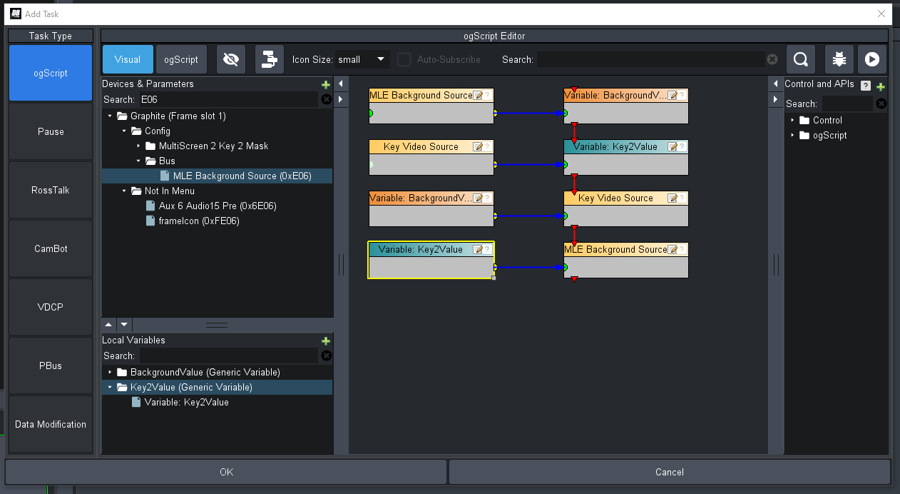 var BackgroundValue = "";var Key2Value = "";BackgroundValue = params.getValue('0xE06', 0);Key2Value = params.getValue('0xDF9', 0);params.setValue('0xDF9', 0, BackgroundValue);params.setValue('0xE06', 0, Key2Value);If you look at the Buses tab of the Live Assist screen and use the "Param Inspector" feature, you should be able to find the appropriate OIDs for your switcher.