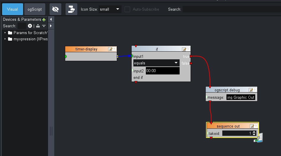 <abs contexttype="opengear" gridsize="20" keepalive="true"> <meta> <lookup id="hosts"> <entry key="myxpression.scriptport">true</entry> <entry key="myxpression.color">-1145302</entry> <entry key="myxpression.rtsystem">rosstalk</entry> <entry key="myxpression.port">params.getValue('myxpression_RossTalkPort', 0)</entry> <entry key="myxpression.xport">params.getValue('myxpression_RossTalkExPort', 0)</entry> <entry key="myxpression.host">params.getValue('myxpression_IPAddress', 0)</entry> <entry key="myxpression.scripthost">true</entry> <entry key="myxpression.scriptrosstalkex port">true</entry> <entry key="myxpression.devicetype">XPression</entry> </lookup> <params> <param access="1" maxlength="0" name="timer-display" oid="timerdisplay" type="STRING" value="00:00" widget="label"/> <param access="1" maxlength="0" name="myxpression_IPAddress" oid="myxpression_IPAddress" type="STRING" value="localhost" widget="0"/> <param access="1" maxlength="0" name="myxpression_RossTalkExPort" oid="myxpression_RossTalkExPort" type="STRING" value="8020" widget="0"/> <param access="1" maxlength="0" name="myxpression_RossTalkPort" oid="myxpression_RossTalkPort" type="STRING" value="7788" widget="0"/> </params> </meta> <timer autostart="false" id="my-timer" pattern="mm:ss" rate="500" start="00:10" stop="00:00"> <timertask tasktype="ogparamset">params.setValue('timerdisplay', 0, event.getDisplay());</timertask> </timer> <param expand="true" height="80" left="100" oid="timerdisplay" style="style:timerLabel;" top="60" width="260"> <task tasktype="ogscript">/*! block id=1001,1000,1003,1002 !*/if (params.getValue('timerdisplay', 0) == "00:00"){ ogscript.debug("Taking Graphic Out"); rosstalk.sendMessage(params.getValue('myxpression_IPAddress', 0), params.getValue('myxpression_RossTalkPort', 0), "SEQO " + 1)} else { }/*!! <block id="1001" type="if" x="358" y="128" w="268" INPUT1="ID:1000" OPERATION="equals" INPUT2="00:00" TRUE="ID:1003" FALSE="" IGNORE="" /><block id="1000" type="param__top&amp;timer-display (timerdisplay)[0]" x="72" y="139" w="243" SET="" /><block id="1003" type="ogscript_debug" x="697" y="295" w="243" MESSAGE="Taking Graphic Out" next="ID:1002" /><block id="1002" type="myxpression_xpression_seqo" x="691" y="395" w="243" color="#ee862a" TAKEID="1" />!!*//*!!<checksum>61cf8474fbde2b4793bb0fedbfcd1591</checksum>!!*/</task> </param> <simplegrid height="80" left="80" rows="1" top="160" width="300"> <button buttontype="push" name="Start"> <task tasktype="timercontrol">ogscript.getTimerManager().getTimer('my-timer').startTimer(false);</task> </button> <button buttontype="push" name="Stop"> <task tasktype="timercontrol">ogscript.getTimerManager().getTimer('my-timer').stopTimer(false);</task> </button> <button buttontype="push" name="Start"> <task tasktype="timercontrol">ogscript.getTimerManager().getTimer('my-timer').resetTimer();</task> </button> </simplegrid></abs>