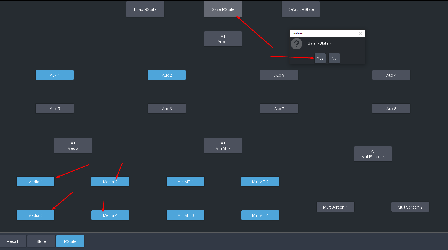 After that we go to the Memory tab in Live Assist.. Make sure to enable that Media Channels recall and also add any of the other item you like (keep in mind the MEs will all save and recall .. no way to have them excluded..) then click on Save RState and confirm the dialog box