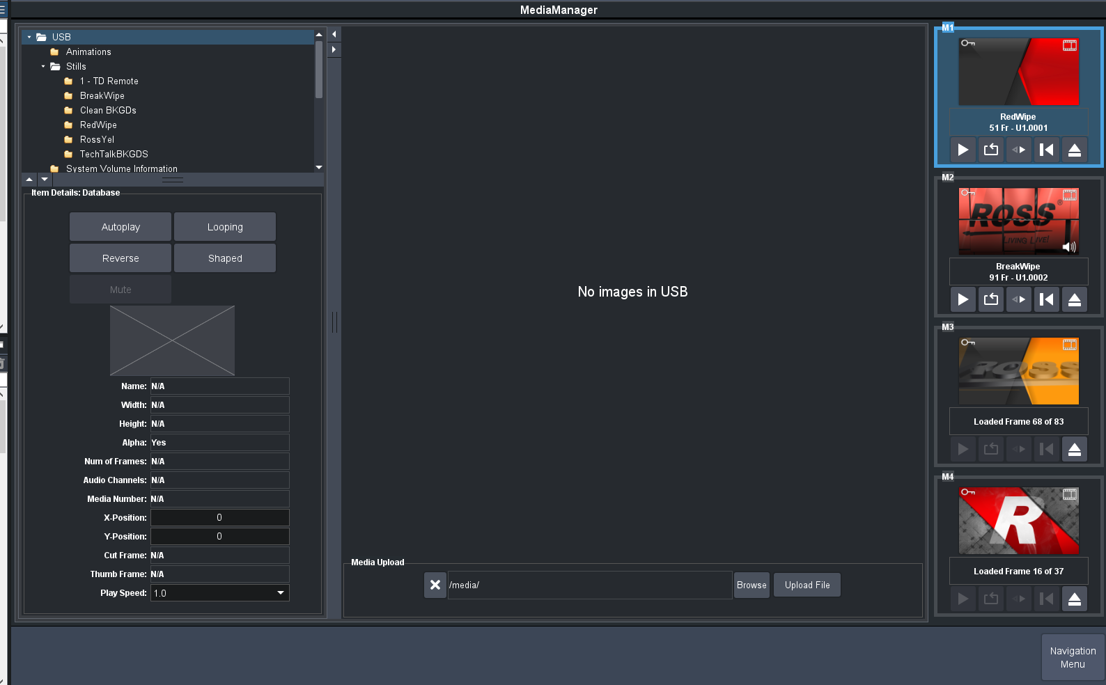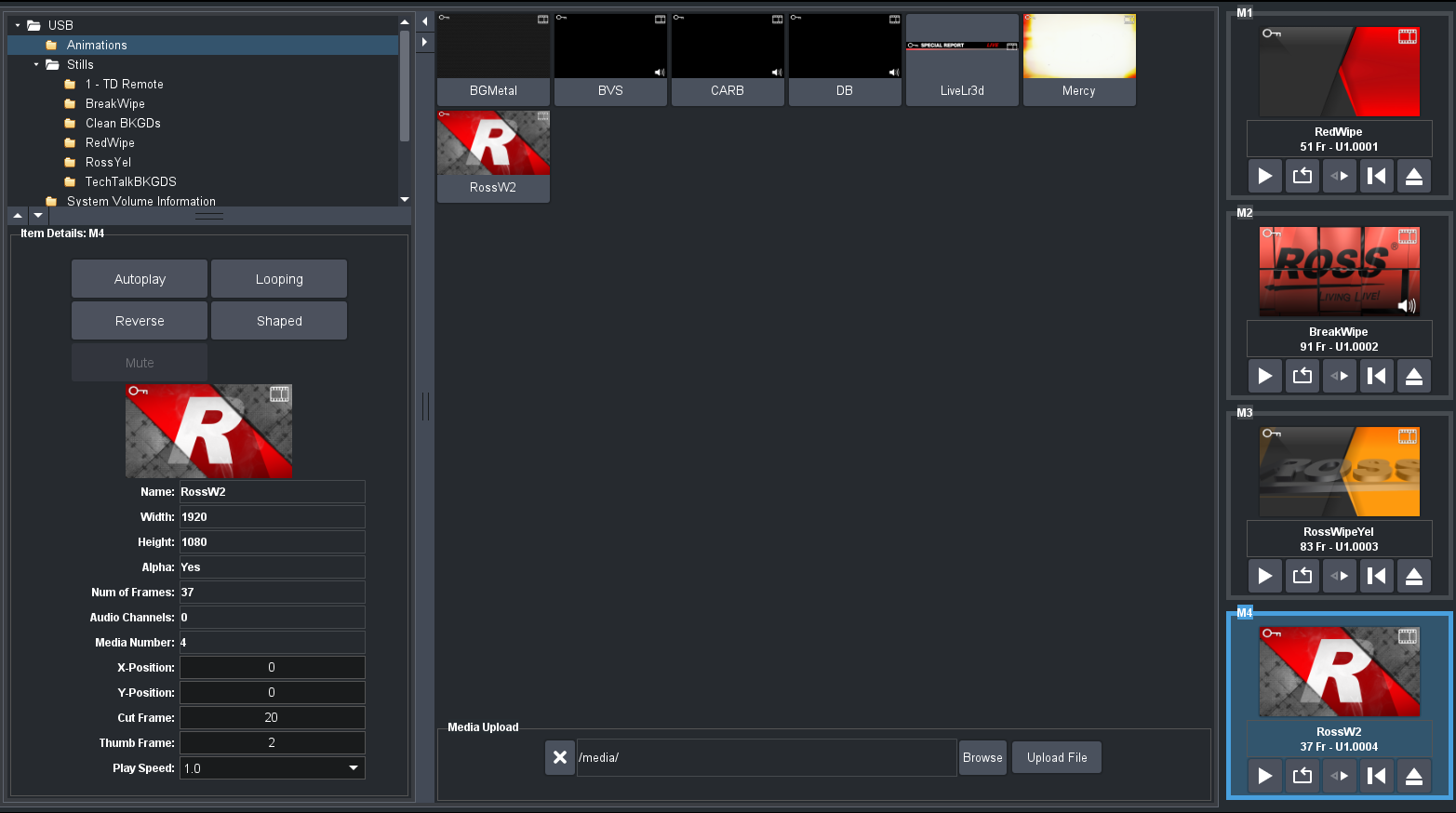 Then Load the media channels to get you the main elements that you need .. (note there is a bit of a "hack here") Media 1 use 3 for it's alpha .. but you could put an Animation in channel 1 and an animation in channel 3 to load even though when you run it you need Channel 3 to be the alpha .. this will get you 2 animated wipes loaded into the RAM for 1/3 and then another two into channel 2/4 RAM ... if you have a few wipes your custom controls are probably swapping between channels on Media 1 or Media 2 for the wipes.. So to do this you first load Channel 1 then 2 then 3 then 4 .. and should get something like this