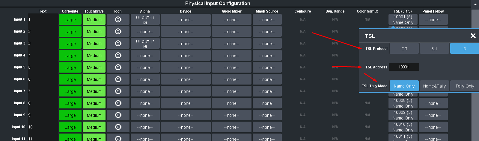 Tallyman will send the TSL Tally protocol to the Carbonite switcher using TSL UMD v3.1 over TCP with those profiles I believe (you will need to confirm that with TSL)