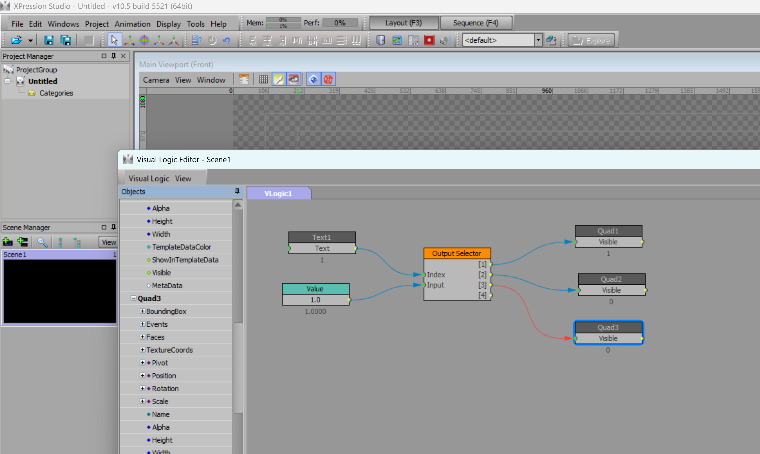 Awesome thanks! Can you explain what is going on the left side? If text1 has a value of 1 it makes quad 1 visible and the other two invisible correct? What is the value from? Is it just if the text 1 is visible? Is there a way to make it if Quad1 is visible the other two are just invisible? Would I have to set it up three times?