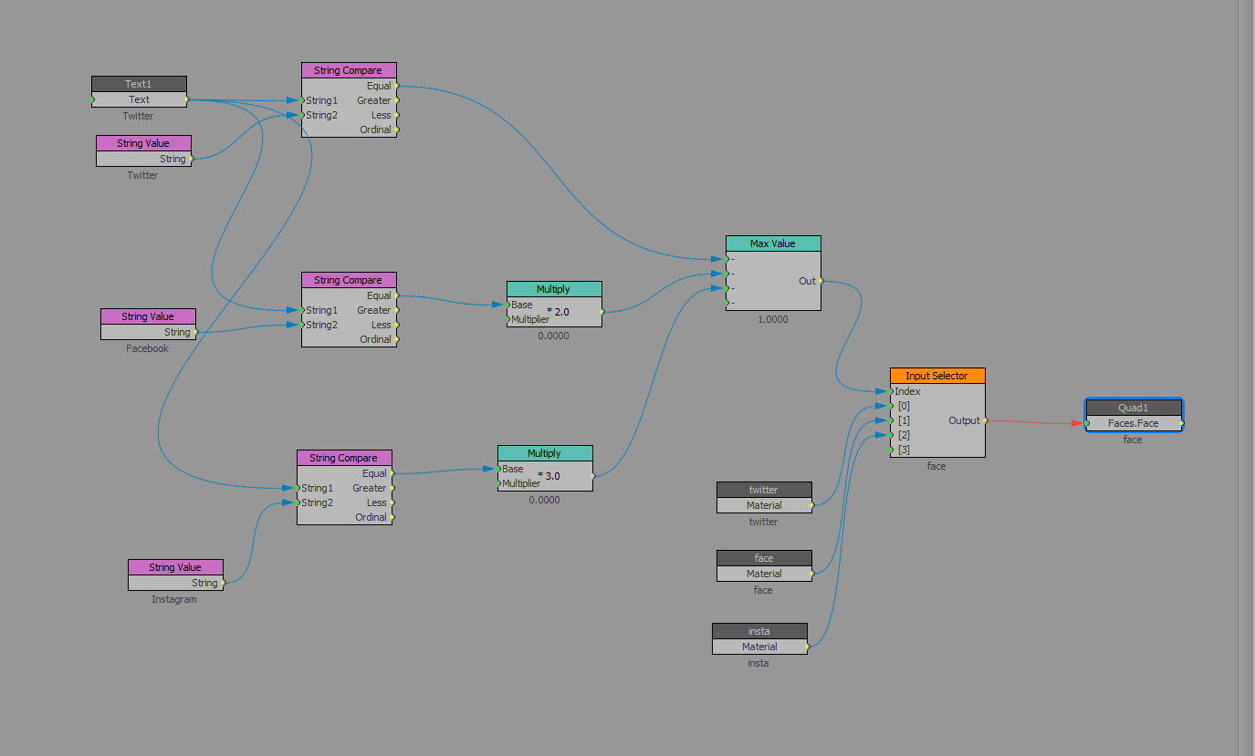 I have been trying to just trouble shoot it, and failing. I'm am trying to use the Name text object linked to String Match function block, for two social groups, but the logo materials don't come in, To start I'm just using two logos, X and BlueSky, and I have three names for X and 3 names for BlueSky. When I have entered one of those names, it needs to match the name to logo and switch the material for the quad.