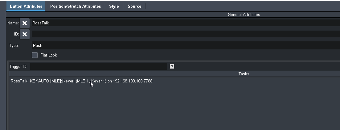 The RossTalk messages available in the Xpression drop-down don't appear to include the command I need to trigger the MDK so I entered it manually.