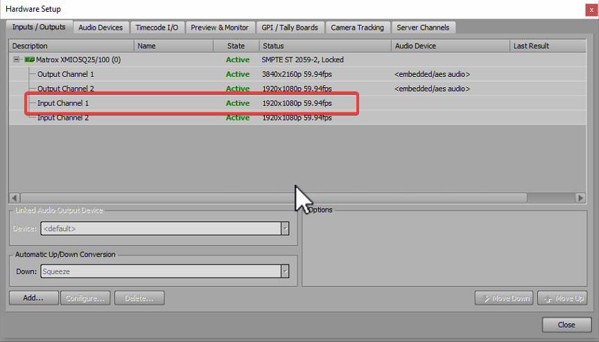 Hardware setup will show the input as "Active" when: